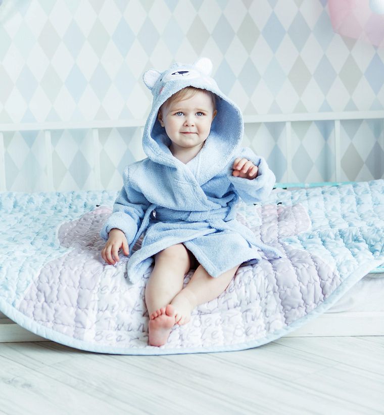 - Махровое полотенце с капюшоном — мягко впитывает влагу и согревает ребенка после купания.