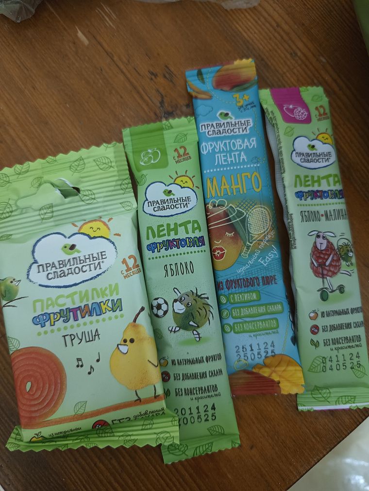 Я на пробу купила маленькую коробочку, весом 250 г. В ней оказалось 16 упаковок, в основном с яблочно-малиновым и яблочно-клюквенным вкусами. Попробовали все, и нам эта сладость очень понравилась. Кто-то откусывал от трубочки, кто-то её разматывал и наслаждался сладко-кислым вкусом.  Так же, мы познакомились с пастилой «ПРАВИЛЬНЫЕ СЛАДОСТИ», которые продаются поштучно в нескольких вариациях в магазинах "Ярче!".
