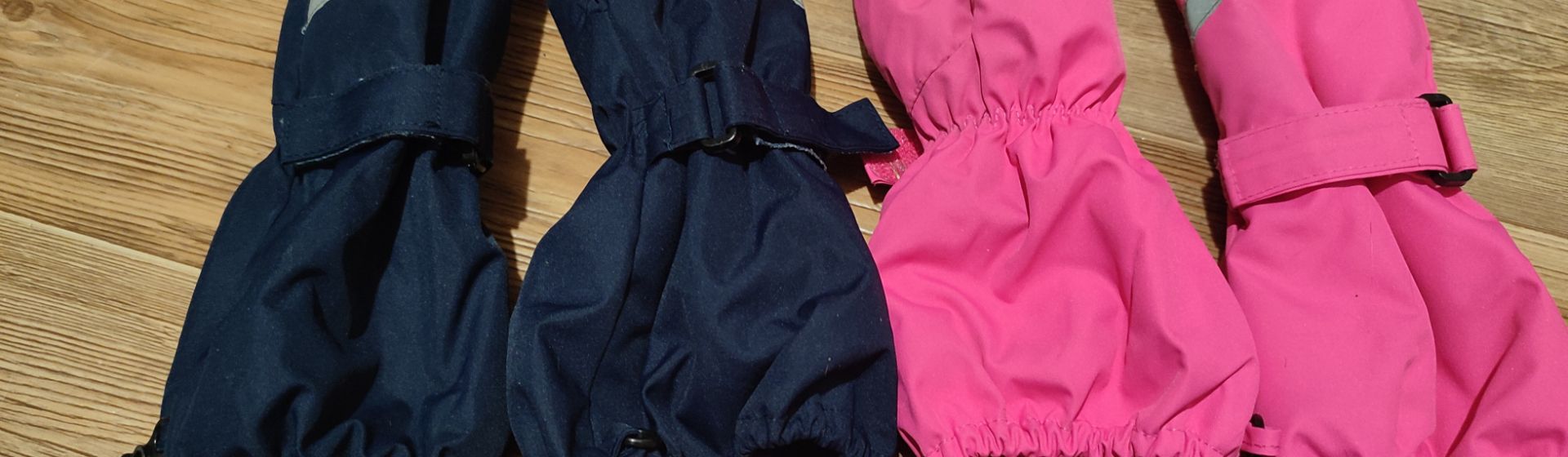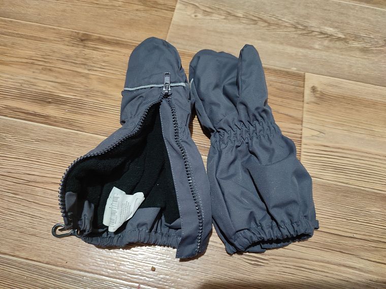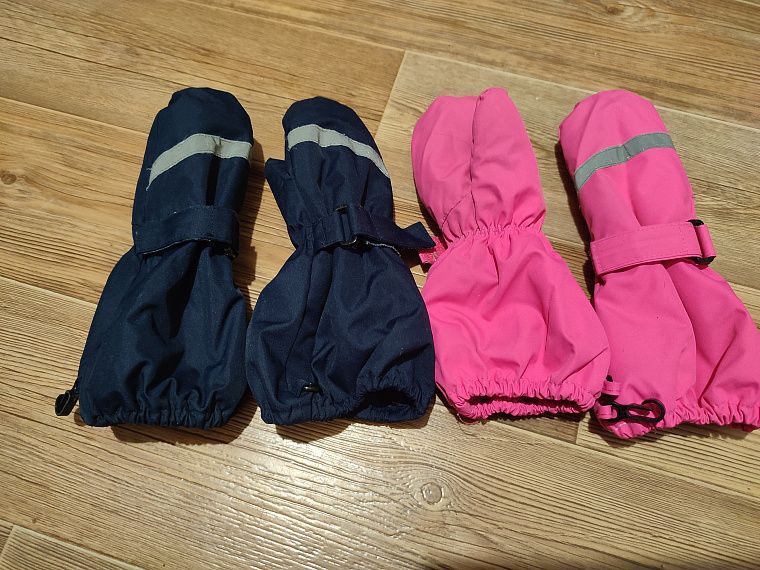 Предусмотрев одежду и обувь, остался вопрос сохранности тепла в ручках. В продаже огромный выбор различных варежек-краг, но они все большие. Нашлись две модели от производителей, на которых я вообще не хотела смотреть, просто случайно попались в магазине, и, о чудо, после примерки оказалось, что они идеально подходят! Указанный 11 размер очень удачно сел на ладошку почти трёхлетней дочери. На варежках предусмотрена удобная молния, можно расстегнуть одеть, и потом застегнуть. Правда выбор расцветок скудный, или серый, или светло-розовый цвета. Отстирывать песок и чёрные полосы с нежно-розовых перчаток мне не хотелось, и я выбрала две пары варежек серого цвета. С прошлого года у нас осталась ещё пара краг.