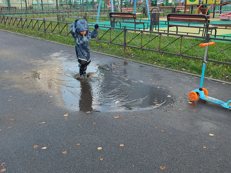 Саму дочь я одеваю в любимый непромокаемый прорезиненный комбинезон проверенного бренда, с резинками, одевающимися на ноги, и никакие брызги и лужи не страшны. Эта одежда всегда тёплая, даже если дочь сидит на качелях или копошится в песочнице.