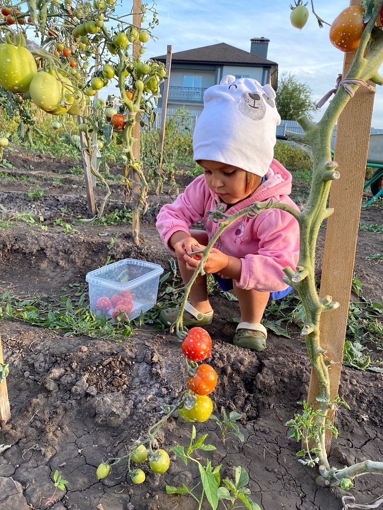 Младшая дочь с удовольствием взяла на себя полив грядок. Как только наступало время и мы брали в руки шланг, дочь бежала за своей маленькой лейкой. И, конечно, дети с нетерпением ждали, когда же плоды начнут созревать.