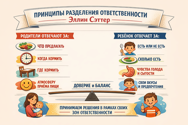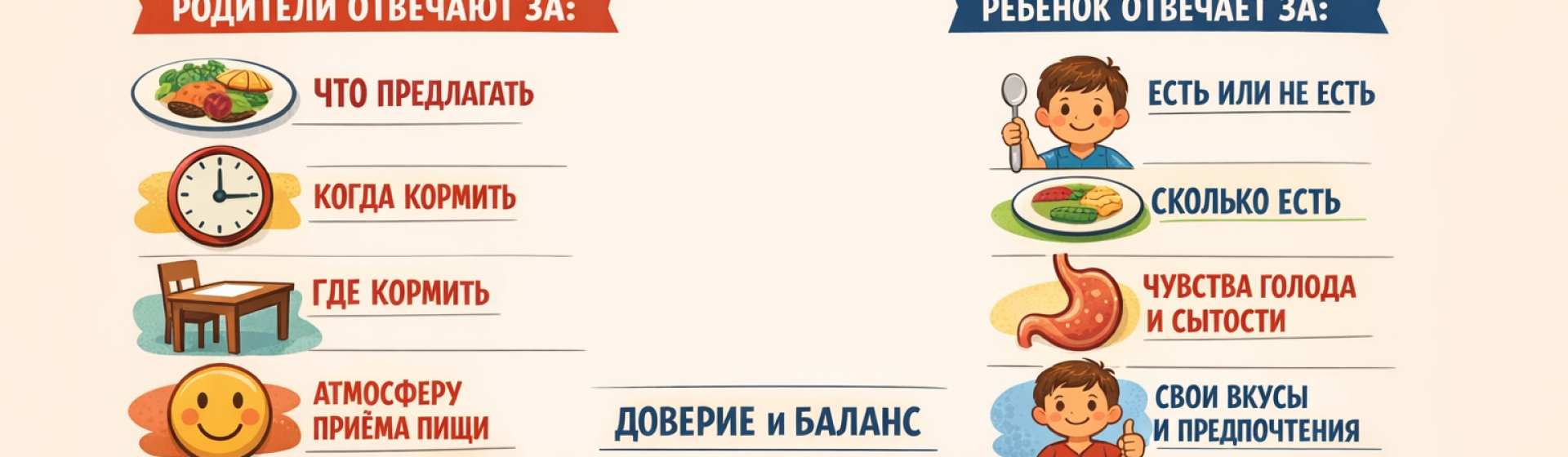 Эффективным и структурированным ответом на эту проблему стала модель, предложенная американским диетологом и семейным терапевтом Эллин Сэттер. Её принцип разделения ответственности (Division of Responsibility in Feeding, sDOR) четко разграничивает задачи родителей и детей.- Родитель решает ЧТО, ГДЕ и КОГДА есть. Это зона нашей ответственности: планировать сбалансированное питание, создавать приятную атмосферу за столом, устанавливать регулярный режим приемов пищи и перекусов.