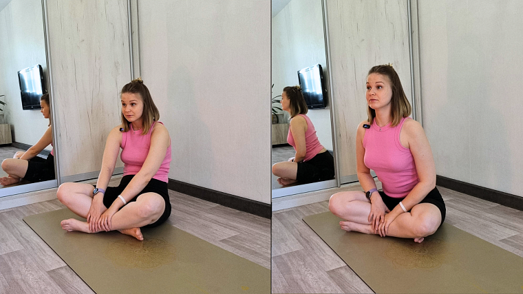 Садимся в простую позу со скрещенными ногами (должно быть комфортно, так что, если нужно, берите пледы и маленькие подушки), и мы будем делать круг рукой в диагонали.
