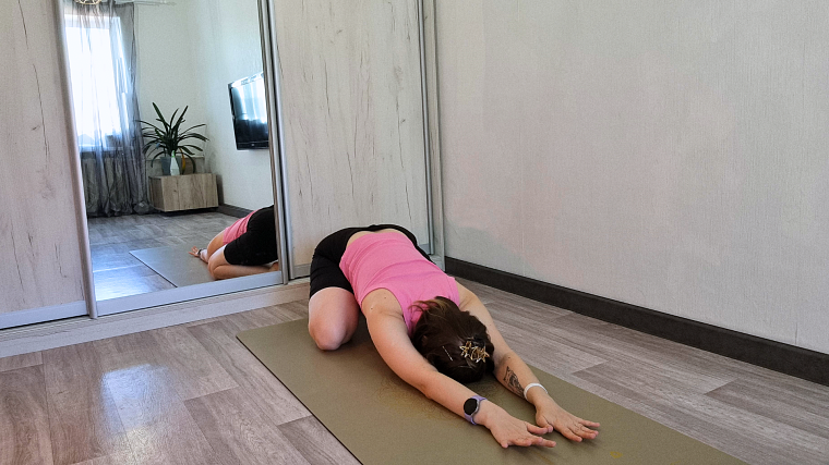 Баласана - поза ребенка. Садимся на пятки и колени, колени ставим на ширине бедер, чтобы нам было комфортно, и опускаемся вниз, вытягивая руки вперед. Лоб на коврик.
