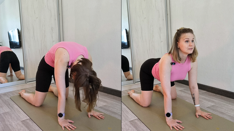 На вдохе выгибаем спину, раскрываем грудную клетку, макушка тянется в потолок. На выдохе скругляем спину, голова опускается между рук. Повторяем.