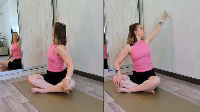 Начинаем правой рукой - вдох - рука направляется вверх, касаясь левого колена, и на - выдохе - мы разворачиваем корпус так, чтобы рука также прошла по диагонали (левой рукой можете себе помочь, положив ее на левое колено). Движение рук - поочередное, соединено с дыханием.